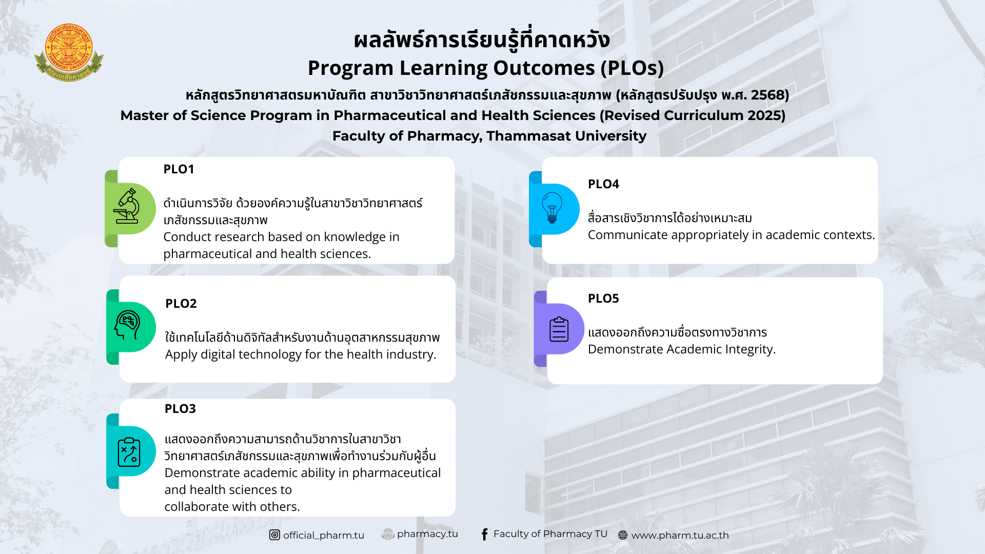 7.3 Applicant must follow the conditions in Thammasat University Notification on application for admission to study at Faculty of Pharmacy in Master of Science Pharmaceutical and Health Sciences, Faculty of Pharmacy.